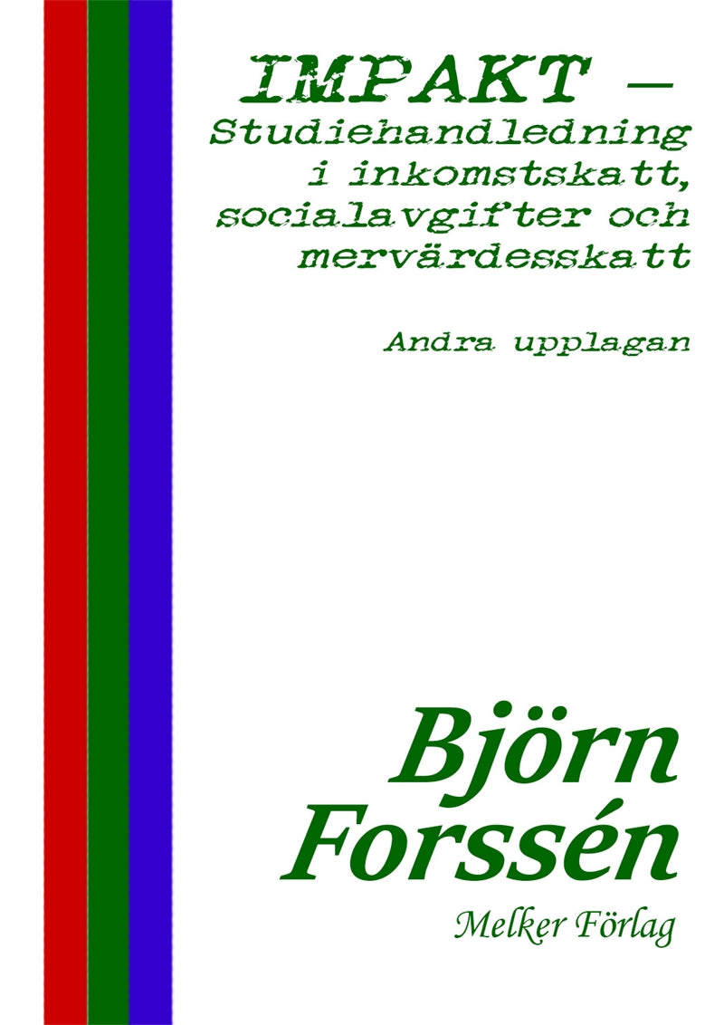 IMPAKT – studiehandledning i inkomstskatt, socialavgifter och mervärdesskatt: Andra upplagan ger läsaren en pedagogisk väg in i den svenska skatterätten. IMPAKT står för Inkomstskatt, Mervärdesskatt (moms), Punktskatt, Arbetsgivaravgifter, Källskatt (skatteavdrag) och Tull. Förkortningen ger läsaren ett enkelt kom-ihåg avseende huvuddelen av de materiella skatter och avgifter som ingår i det svenska skattesystemet. Innan den fördjupande företagsbeskattningsdelen behandlas, innehåller boken en översiktlig genomgång av det inkomstskatterättsliga området och de tre inkomstslagen: näringsverksamhet (NRV), tjänst och kapital. Ambitionen med denna studiehandledning är att ge läsaren en introduktion till framför allt inkomstskatterätten, men även till dess förhållande till andra skatteslag och avgifter såsom i första hand socialavgifterna och momsen.