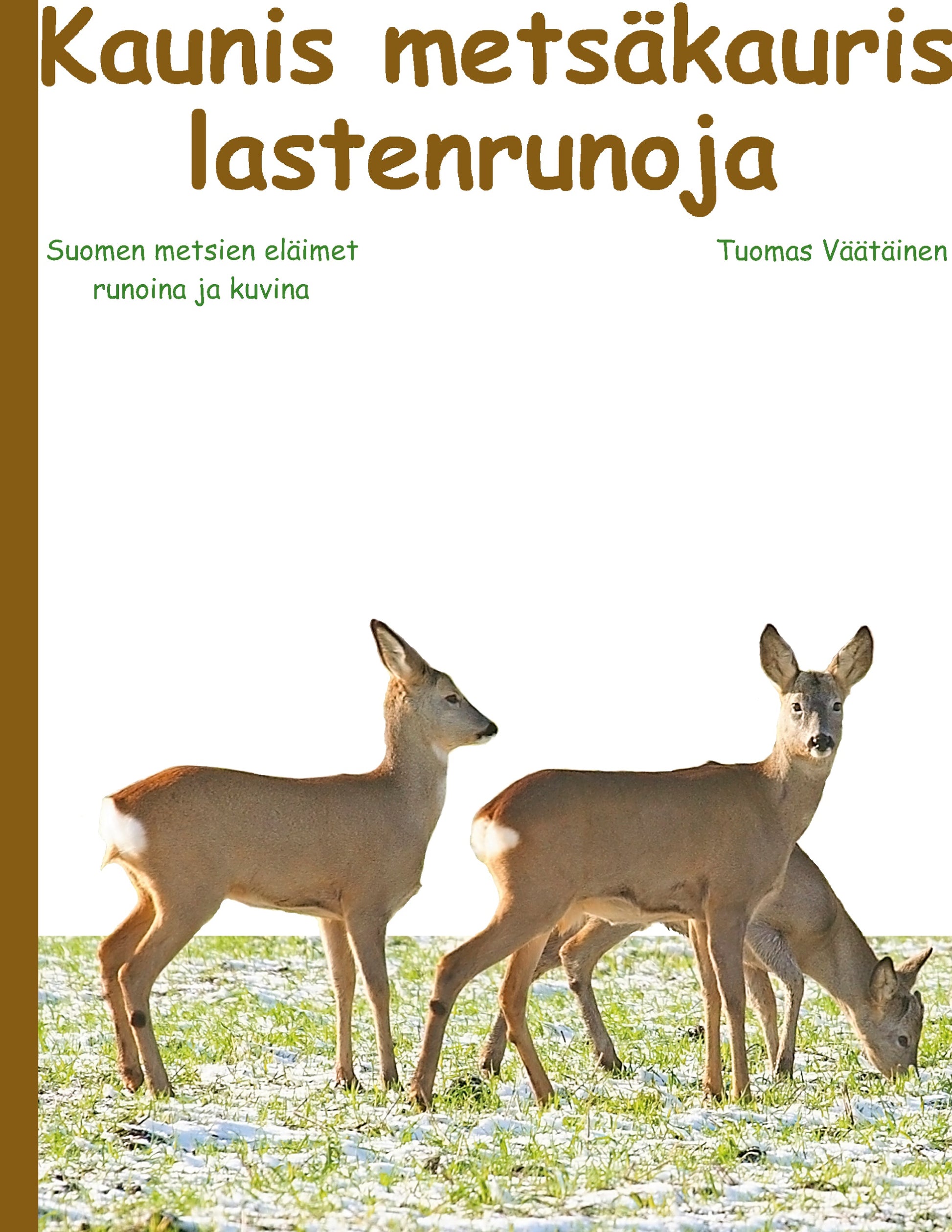 Metsäkauris tosi nätti kotimetsän taakseen jätti Suuntana sillä naurismaa siellä kauriit herkkuja saa Perille saapuu kauris viimein tarinan kerron sinulle riimein Pellolla paljon on kauriita ja niille kaikille riittää nauriita Mukavia suomalaisia eläinrunoja kuvien kera Tässä kirjassa on lastenrunoja, jotka esittelevät Suomen metsien eläimet kauniiden kuvien kanssa Niin karhu kuin kettu sekä ilves ja susi ovat metsäkauriin ja pienempien eläinten, kuten kärpän ja hillerin kanssa mukana tässä runokirjassa Yhteensä 32 kpl eläimiä on kirjan sivuilla Tämän kirjan avulla oppii myös tuntemaan metsiemme eläimet Tämä kirja on kuitenkin ennen kaikkea lastenrunokirja runoista tykkääville