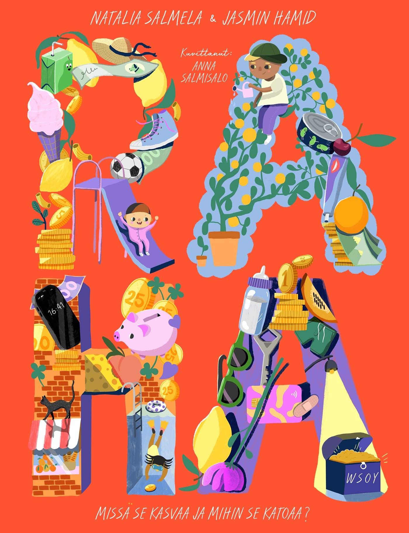 Niin kuin lapsiperheissä aina, myös Emilin, Britan ja Tuiskun perheessä lapset toivoisivat, ettei äidin tarvitsisi mennä töihin. Kun he tällä kertaa marisevat asiasta, seurauksena onkin kattava selitys siitä, miksi ihmiset käyvät töissä ja miksi äiti myös tykkää siitä. Kaiken takana luuraa kummallinen juttu, raha, jolla saa leluja ja herkkuja, mutta jota pitäisi riittää myös muihin asioihin. Paljonko arjen asiat oikein maksavat ja mikä neuvoksi, jos rahaa ei ole tarpeeksi? Tästä hauskasta kirjasta löytyvät vastaukset vähän erikoisempiinkin kysymyksiin. Sen takana ovat raha-asioita ja perherooleja ennakkoluulottomalla tavalla podcastissaan käsittelevät Natalia Salmela ja Jasmin Hamid sekä kuvittaja Anna Salmisalo.