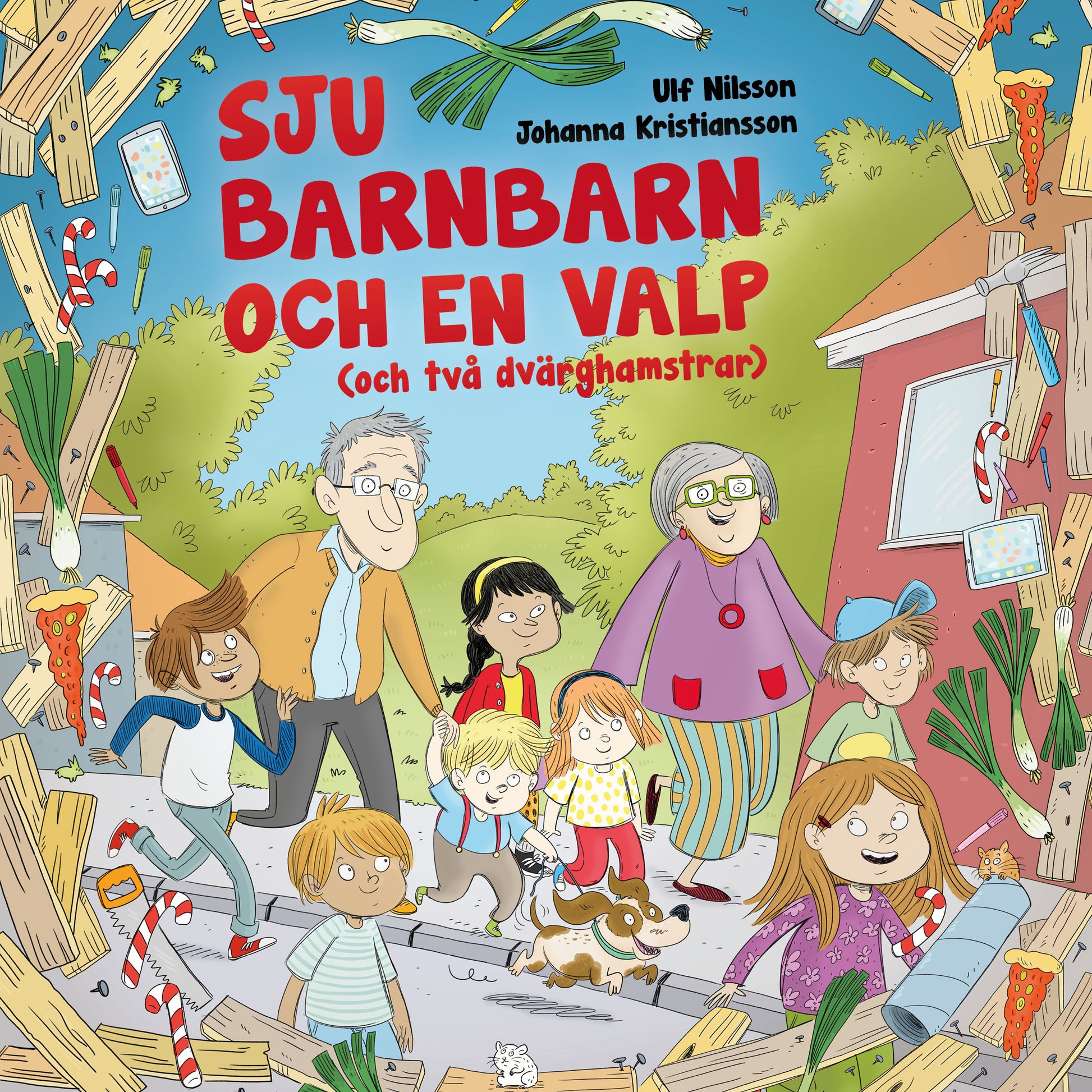 Mormor och morfar sitter och vilar. Det är lugnt och tyst. Och städat och fint. Snart kommer alla! Det ska bli SÅ roligt att passa barnbarnen. Och roligt blir det! Fast kanske inte precis så som mormor och morfar hade tänkt ... Sju barnbarn väller in -- tillsammans med en valp och två dvärghamstrar. Hur ska det gå? Mormor har storstilade planer på museibesök, men det visar sig inte riktigt realistiskt. Och morfar, ja han försöker bara hålla någorlunda ordning mitt i kaoset. Sju barnbarn och en valp (och två dvärghamstrar) är en dråplig berättelse om ett dygn där tålamod prövas, datorer fattar eld, kojor snickras, och dvärghamstrar försvinner. Författad av Ulf Nilsson och illustrerad av Johanna Kristiansson -- den perfekta högläsningsboken!